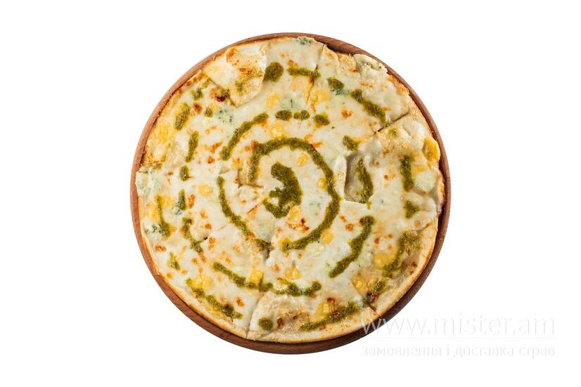Основа, соус песто, сир моцарелла, сир пармезан, сир горгонзола, сир едам, соус томатний або вершковий.