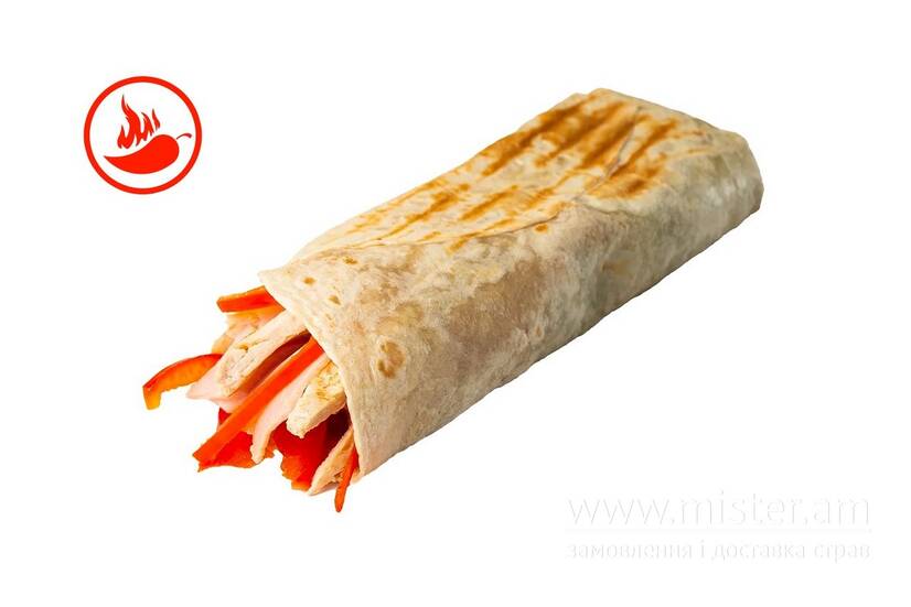 Це тонка, випечена по-домашньому тартілья, у яку загорнуті шматочки натурального курячого філе та бекону, в поєднанні з соковитим болгарським перцем, цибулею та перцем чилі, заправлена ніжним майонезом або олією на вибір