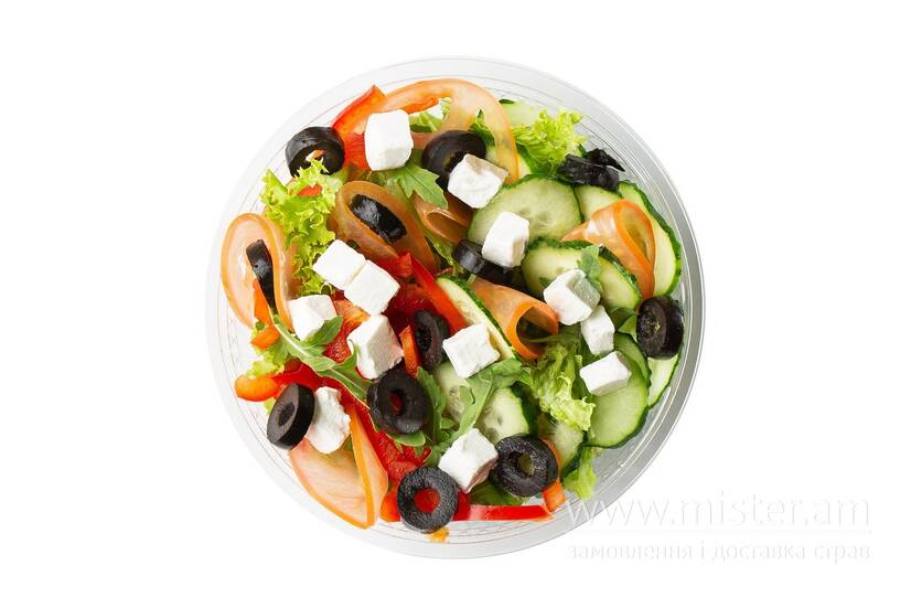 Класичний салат з свіжими помідорами, огірком, болгарським перцем, листям салату, сиром Фета та маслинами