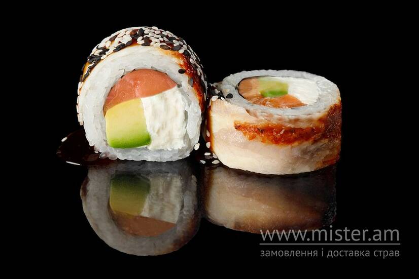 Рис, вугор, омлет томаго, авокадо, сир Філадельфія, соус унагі, кунжут.