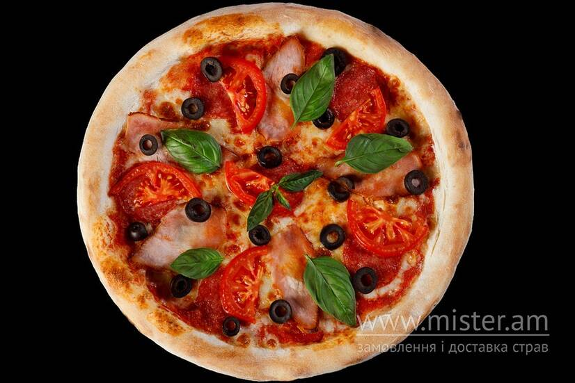 Томатна основа, сир моцарела, салямі, шинка, помідори, маслини, базилік.