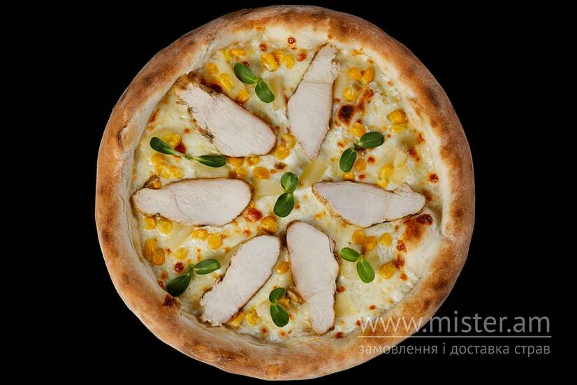 Вершкова основа, сир моцарела, курка, кукурудза, ананас, мікрогрін.