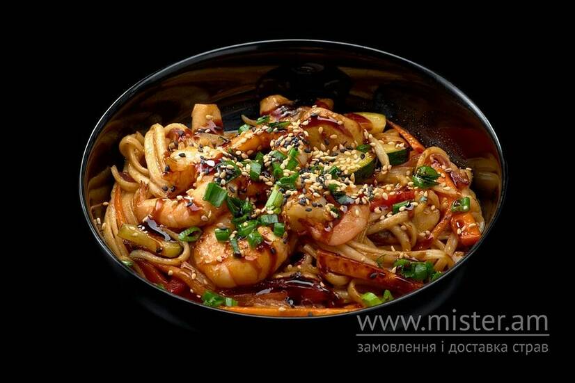 Локшина удон, тигрові креветки, цукіні, болгарський перець, печериці, морква, синя цибуля, часник, зелена цибуля, соус унагі, кунжут.