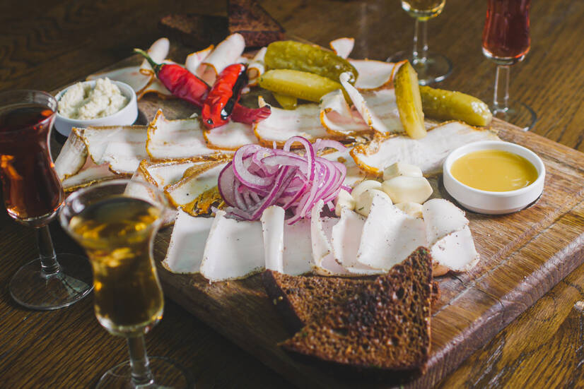 Сало мариноване в чорному перці, сало мариноване в червоному перці, сало генеральське копчене, сало генеральське спайсі гостре, подається з чорним хлібом, гірчицею, хріном, перцем чилі, домашньою квашениною (450 г)