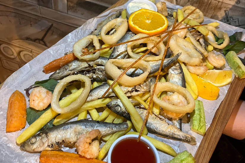 Кільця кальмара, рибка салака, креветки, картопля фрі, морква та кабачок фрі, подається з соусами солодкий чилі та часниковий (1100/40/40 г)