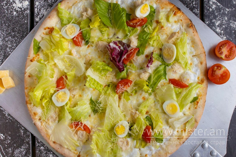 Вершкова основа, моцарела, куряче філе, помідори чері, перепелині яйця, мікс салату, пармезан.