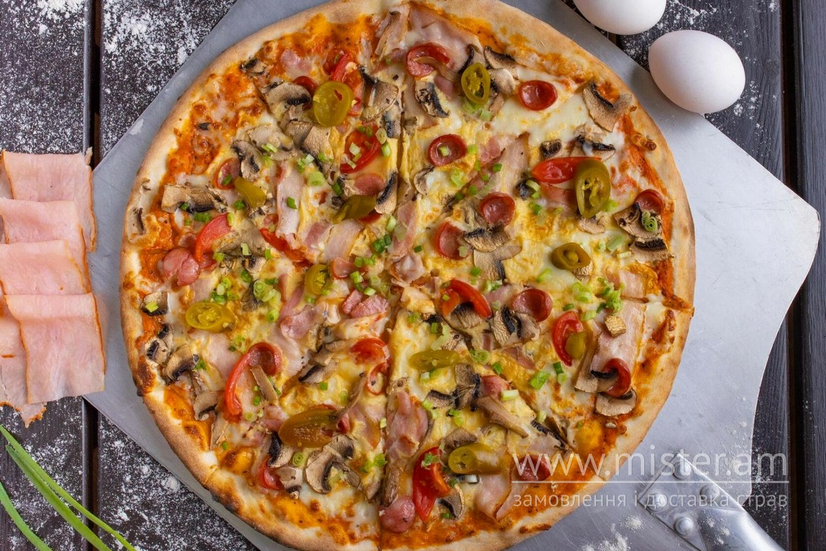 Томатно-вершкова основа, моцарела, бекон, мисливські ковбаски, шампіньйони, помідори чері, омлет, халапеньйо, зелена цибуля.