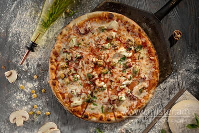 Томатна основа, сир моцарела, коктейль морепродуктів (кальмари, мідії, восьминіг, креветки) в маринаді (лимон, зелень, оливкова олія), мікрогріни.