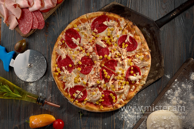 Томатна основа, сир моцарела, салямі, куряче філе, кукурудза.