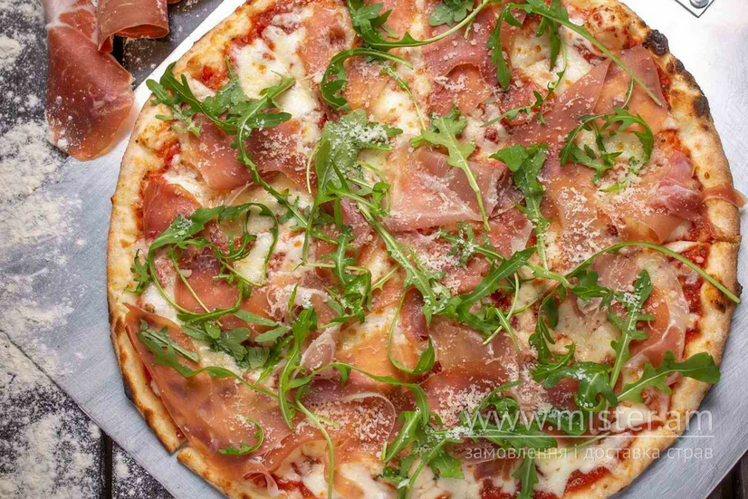 Томатна основа, сир моцарела, прошутто крудо, рукола, пармезан.