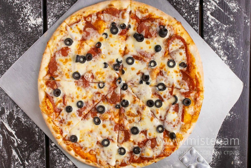 Томатна основа, моцарела, салямі пепероні, оливки.