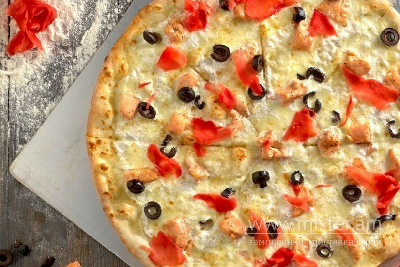 Вершкова основа, сир моцарела, лосось, оливки чорні, імбир маринований.