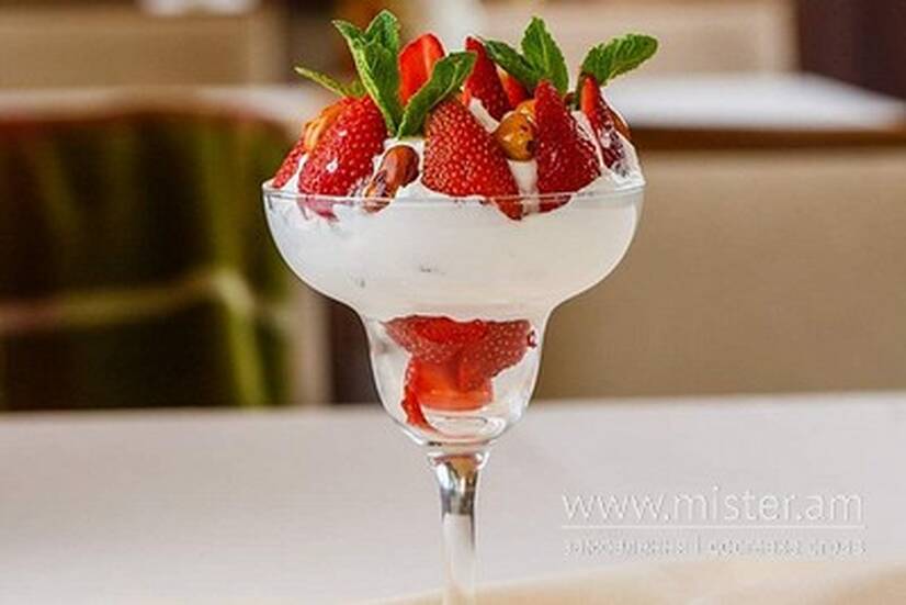 Полуниця з йогуртом та карамелізованим фундуком