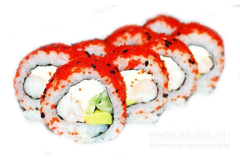 Рис, норі, креветка, авокадо, огірок, суші-сир, ікра тобіко червона, кунжут.