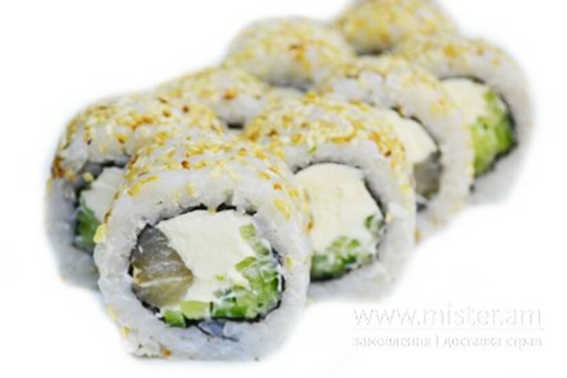 Суші рис, водорослі норі, суші-сир, огірок, кунжут білий, масляна копчена (есколар).