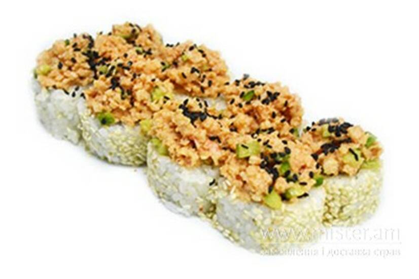 Суші рис, суші-сир, водорослі норі, томати, базилік, огірок, соус спайсі, кунжут чорний, м'ясо креветки.
