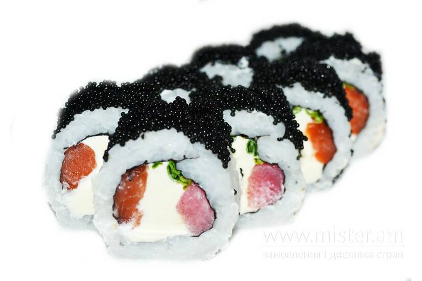 Рис, норі, лосось, тунець, суші-сир, цибуля зелена, ікра Тобіко чорна, кунжут.