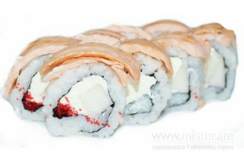 Суші рис, водорослі норі, груша, суші-сир, кунжут білий, соус унагі, лосось грильований, ікра тобіко червона.