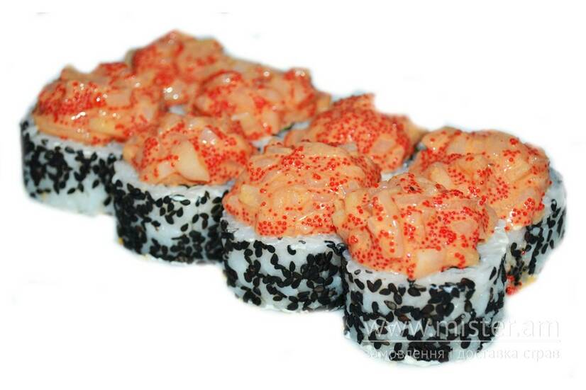 Рис, норі, суші-сир, огірок, гребінець, водорослі норі, соус спайсі, кунжут чорний, ікра тобіко червона.