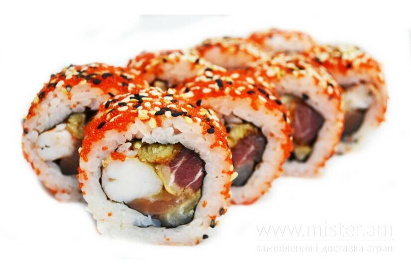 Рис, норі, лосось, тунець, вугор, креветка, масляна копчена (есколар), ікра масаго, кунжут чорний.