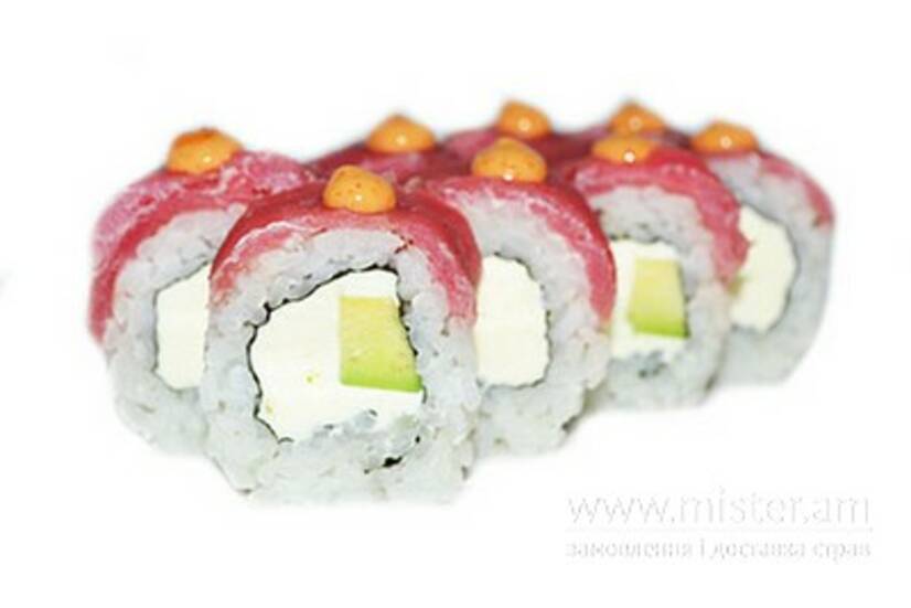 Рис, норі, тунець, авокадо, суші-сир, соус спайсі, кунжут чорний, майонез японський.