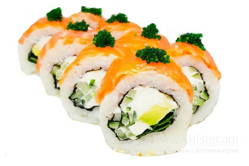 Авокадо, лосось копчений, водорослі норі, огірок, суші рис, суші-сир, цибуля зелена, ікра тобіко зелена, кунжут білий.