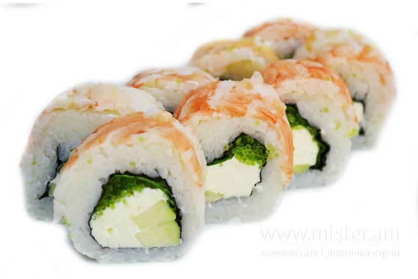 Водорослі норі, суші-сир, базилік, кунжут білий, авокадо, ікра тобіко зелена, суші рис, креветка королівська.
