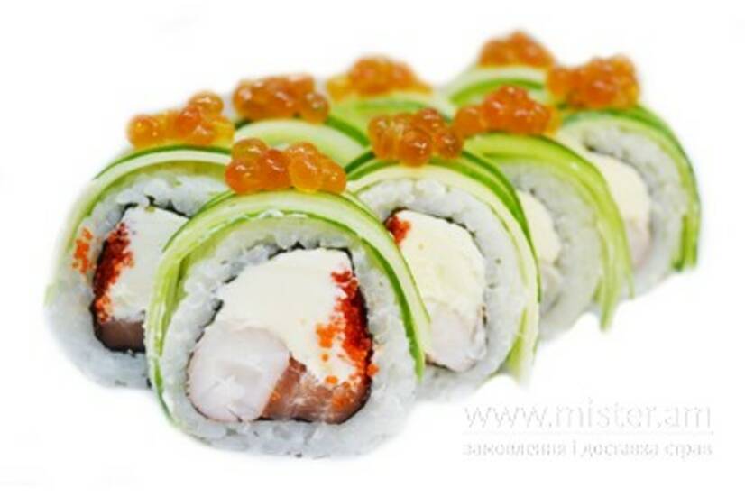 Рис, норі, суші-сир, креветка, лосось, ікра тобіко, огірок, ікра лосося.