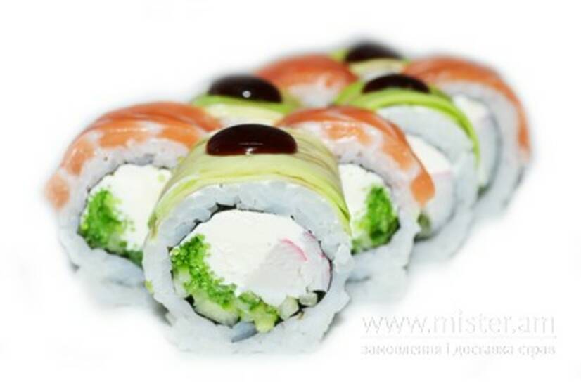 Ікра тобіко зелена, авокадо, сніжний краб, кунжут білий, лосось с/с, водорослі норі, огірок, суші рис, соус унагі, суші-сир.