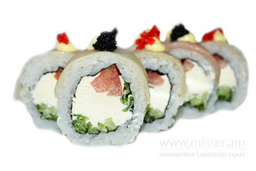 Водорослі норі, огірок, цибуля зелена, масляна копчена (есколар), томати, майонез японський, суші-сир, суші рис.