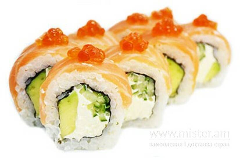 Ікра лосося, авокадо, лосось с/с, водорослі норі, огірок, суші-сир, кунжут білий, суші рис.