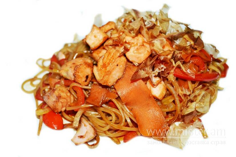 Рисова лапша, лосось с/с, морква, цибуля ріпчата, перець болгарський черв., кунжут білий, соус теріякі, лимон.