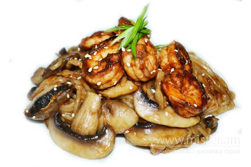 Рисова лапша, креветка королівська, гриби шампіньйони, соус теріякі, часник.