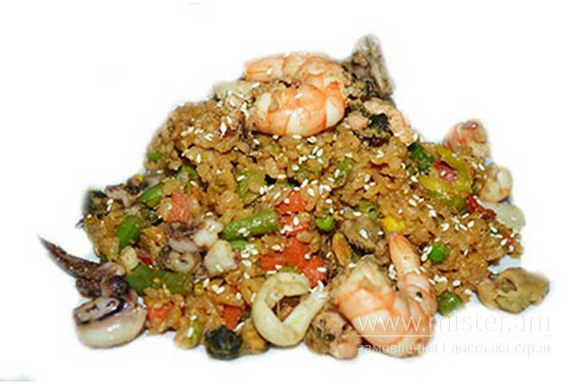 Рис, яйце, цибуля порей/зелена, соус устричний, коктель із морепродуктів