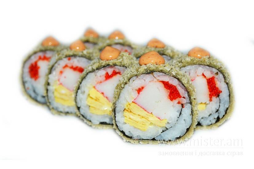 Омлет, ікра тобіко червона, водорослі норі, соус спайсі, майонез япон., сніжний краб, темпура, суші рис.