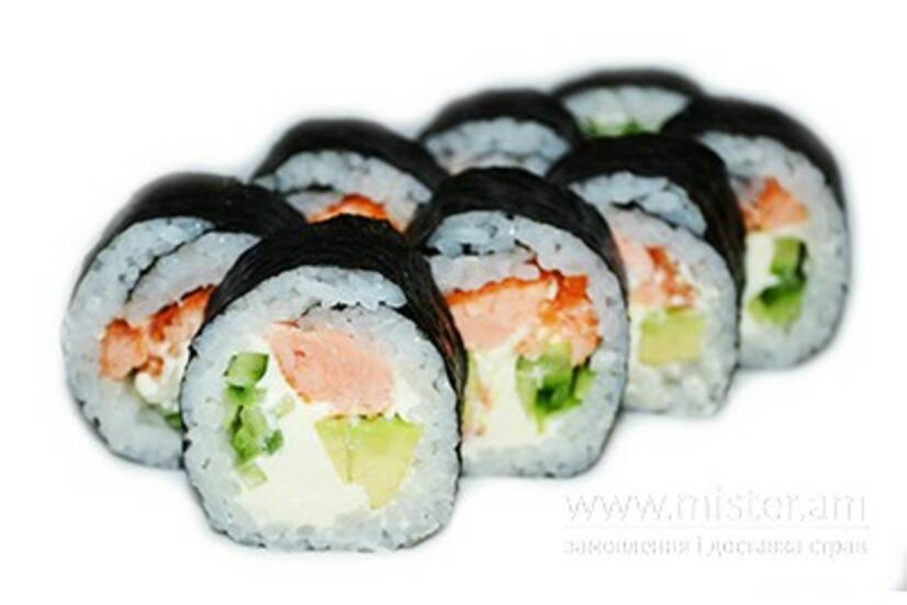 Рис, норі, авокадо, лосось смажений, огірок, суші-сир, кунжут білий.