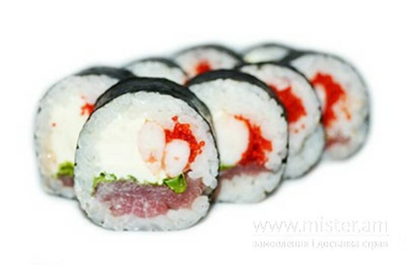 Рис, норі, тунець, креветка, суші-сир, ікра Тобіко, листя салату, кунжут білий.