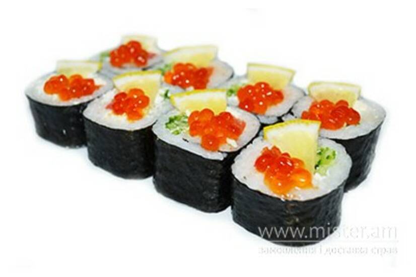 Рис, норі, лосось копчений, огірок, суші-сир, ікра лосося, лимон, кунжут чорний.