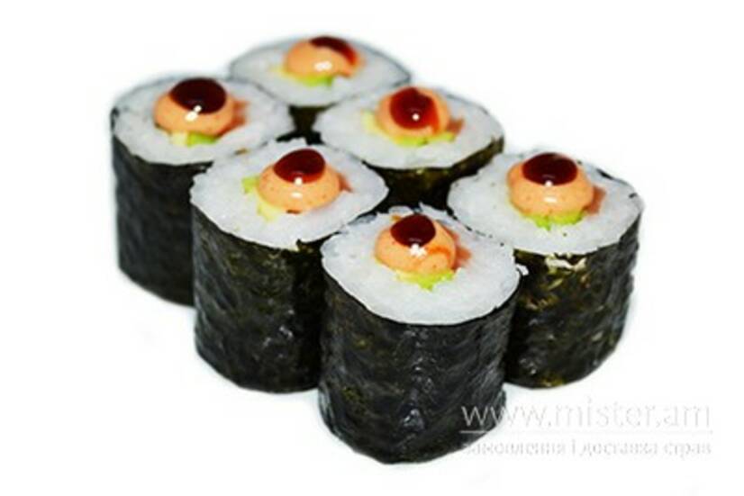 Рис, норі, лосось, авокадо, кунжут білий, соус спайсі.