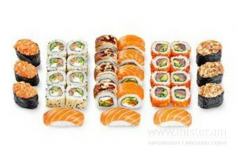 Кошик спайсі з лососем 3 шт, Кошик спайсі з гребінцем 3 шт, Нігірі лосось 3 шт, Каліфорнія роял, Сенсей, Каліфорнія тобіко магуро.