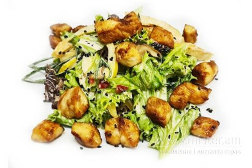 Листя салату, гриби шитакі, омлет, перець болгарський червоний, цибуля порей, курка теріякі смажений, майонез японський.