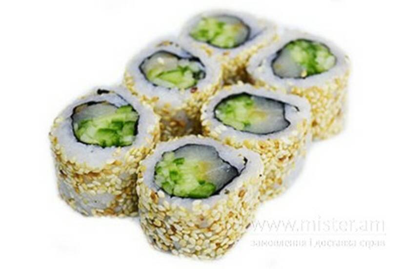 Масляна копчена (есколар), водорослі норі, кунжут білий, огірок, суші рис.
