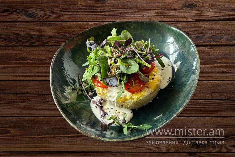 Скрамбл з кускусом, мікс салату, вершковий соус.