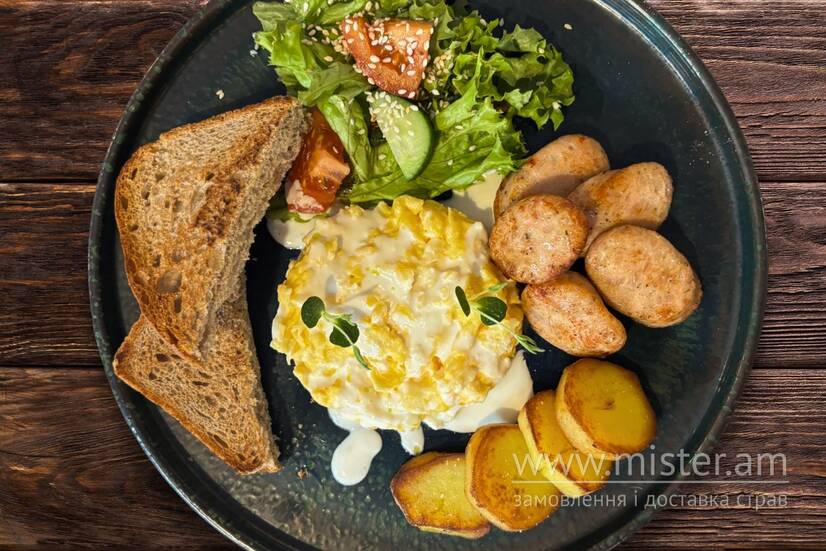 Скрамбл, картопелька смажена, ковбаска куряча, мікс салату; грінки з житнього хліба, сирний соус.