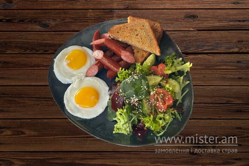 Яєшня з мисливськими ковбасками, мікс салату; грінки з житнього хліба.