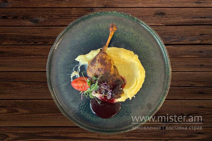 Качина ніжка з картопляним пюре та вишневим соусом