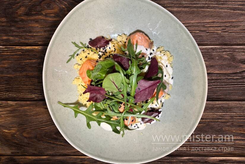 Філе лосося з кускусом, сирним соусом та міксом зелені