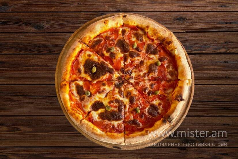Гостра, папероні, каперси, соус томатний, моцарела.