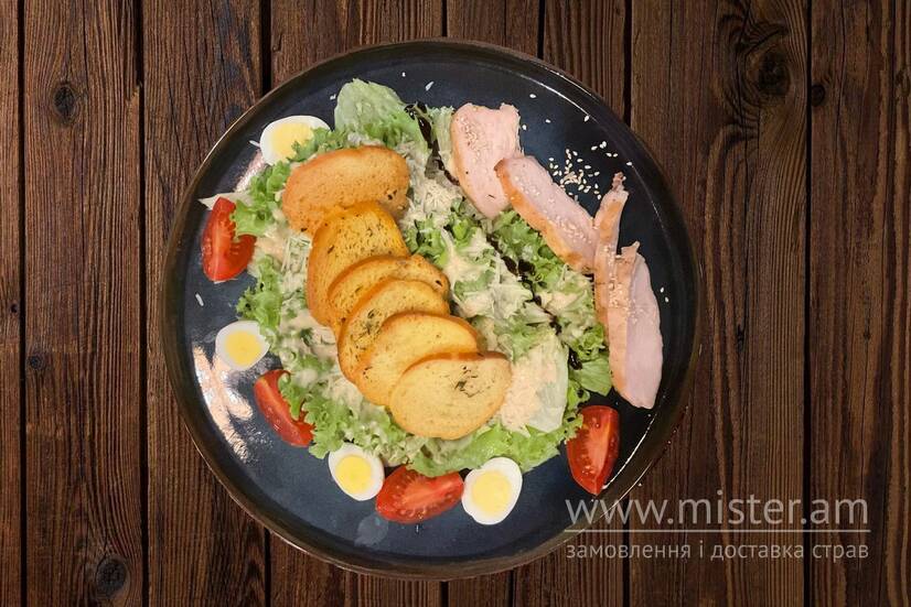 Куряче філе, пармезан, помідор чері, крутони, перепелині яйця, листя салату, соус цезар.