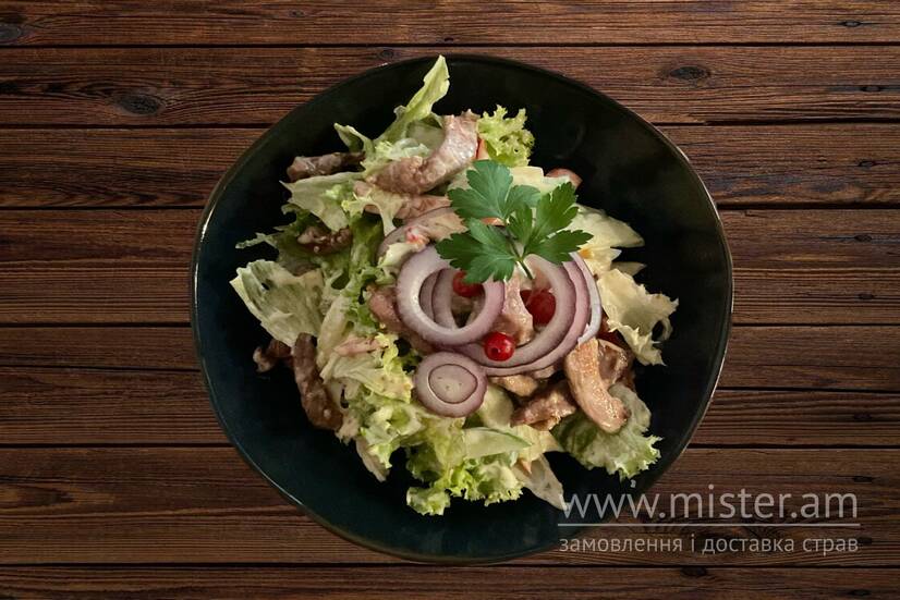 Телятина, огірок, помідор чері, перць болгарський, листя салату, часниково-гірчичний соус.